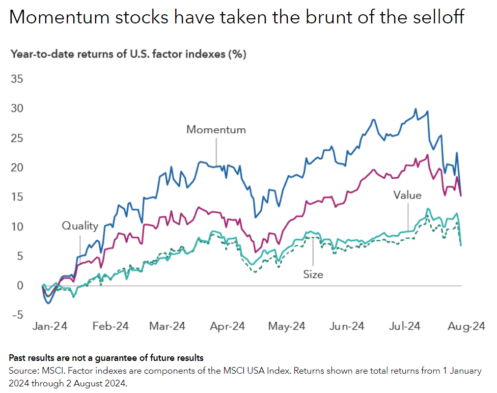 De werkgelegenheidscijfers van vrijdag tonen misschien dat we op weg zijn naar een recessie, maar het is niet duidelijk of we ons al in een recessie bevinden. Gezien de heftige schommelingen die we tot nu toe hebben gezien na de publicatie van individuele economische cijfers, en de marktverwachtingen voor renteverlagingen, is het verstandig om vooruit te kijken en te focussen op het grotere geheel bij het bepalen van het juiste moment om posities aan te passen.
