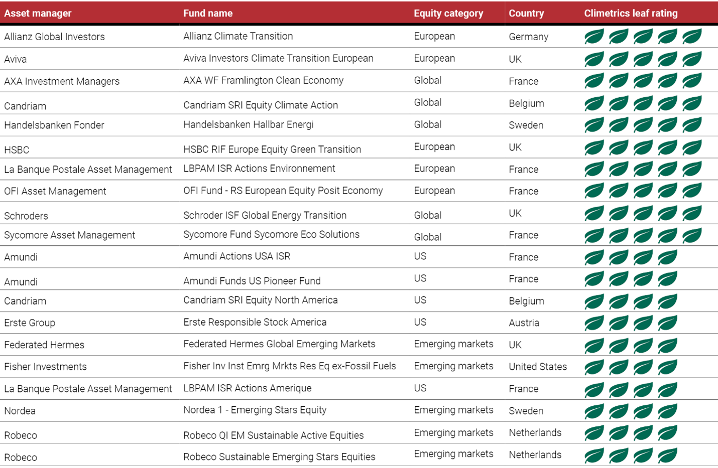 Les cinq premiers fonds gérés activement pour chaque catégorie d'actions ont été sélectionnés sur la base de leur score Climetrics sous-jacent. Dans les catégories "actions mondiales" et "actions européennes", tous les fonds sont classés dans la catégorie "5 feuilles", tandis que dans les catégories "actions émergentes" et "actions américaines", la note la plus élevée est de "4 feuilles".