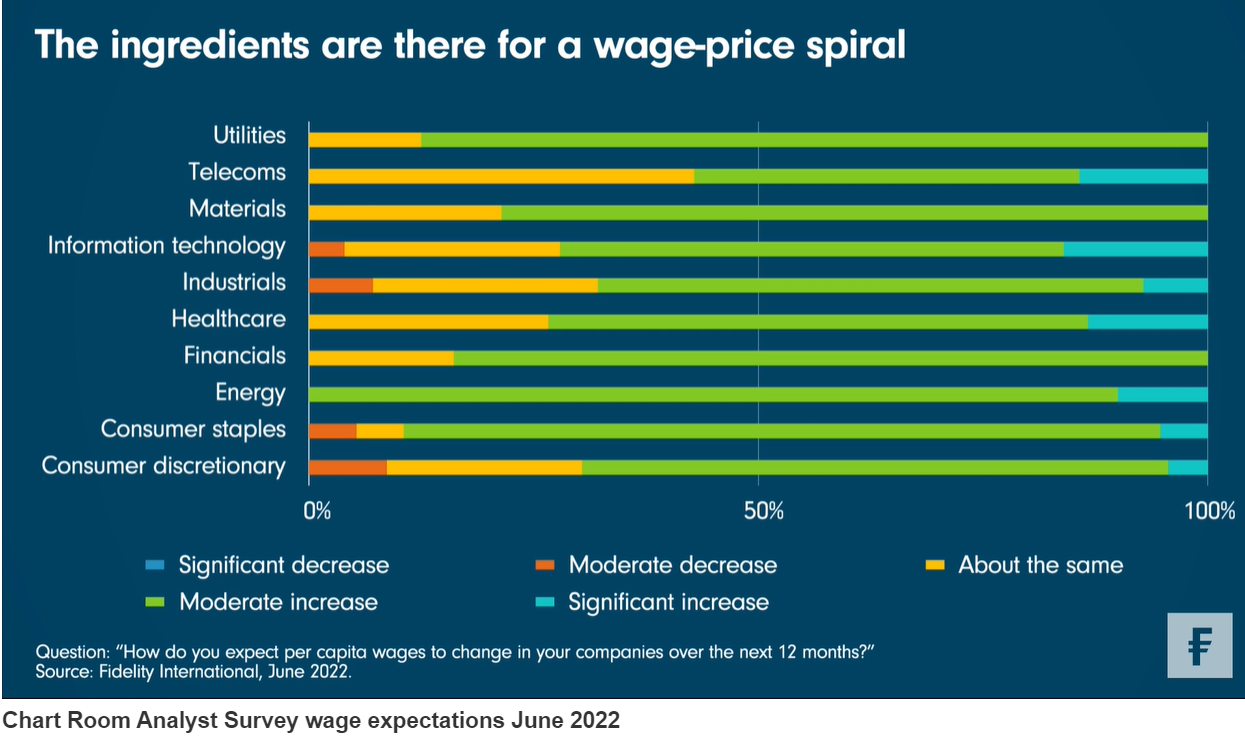 Are central banks right to worry about a wage-price spiral? Our latest monthly Analyst Survey suggests it is a distinct possibility, with 79 per cent of FIL analysts saying they expect to see per capita wages rise over the next 12 months at the companies they cover. And as this week’s chart shows, such expectations are held by analysts covering all sectors of the economy. These findings represent on-the-ground evidence of what seems to have spooked central bankers in recent weeks.