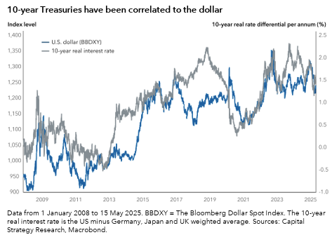 “In de onderstaande grafiek is te zien dat de eigenlijke prestatie van de dollar meer afhangt van cyclische factoren zoals groei en reële rente. Deze twee zijn nauw met elkaar verbonden, omdat renteverschillen tussen landen doorgaans een verschil weerspiegelen in groei en inflatie, waarbij een sterkere groei over het algemeen leidt tot hogere rentetarieven”, aldus Søndergaard.
