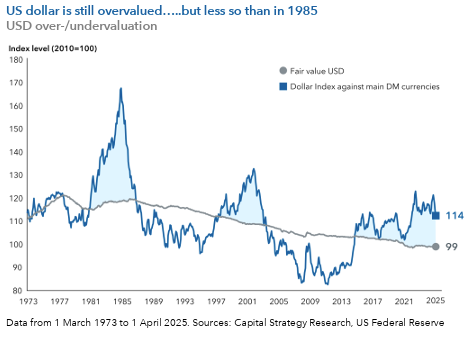 De Amerikaanse dollar is volgens fundamentele waarderingsmodellen al bijna een decennium overgewaardeerd. Toch is het nog te vroeg om te concluderen dat we ons nu in een periode van structurele dollarzwakte bevinden, zegt Søndergaard. “Daarvoor zouden we een scherpe terugval in de Amerikaanse groei of een recessie moeten zien, en/of een duidelijke groeiversnelling in andere delen van de wereld.”