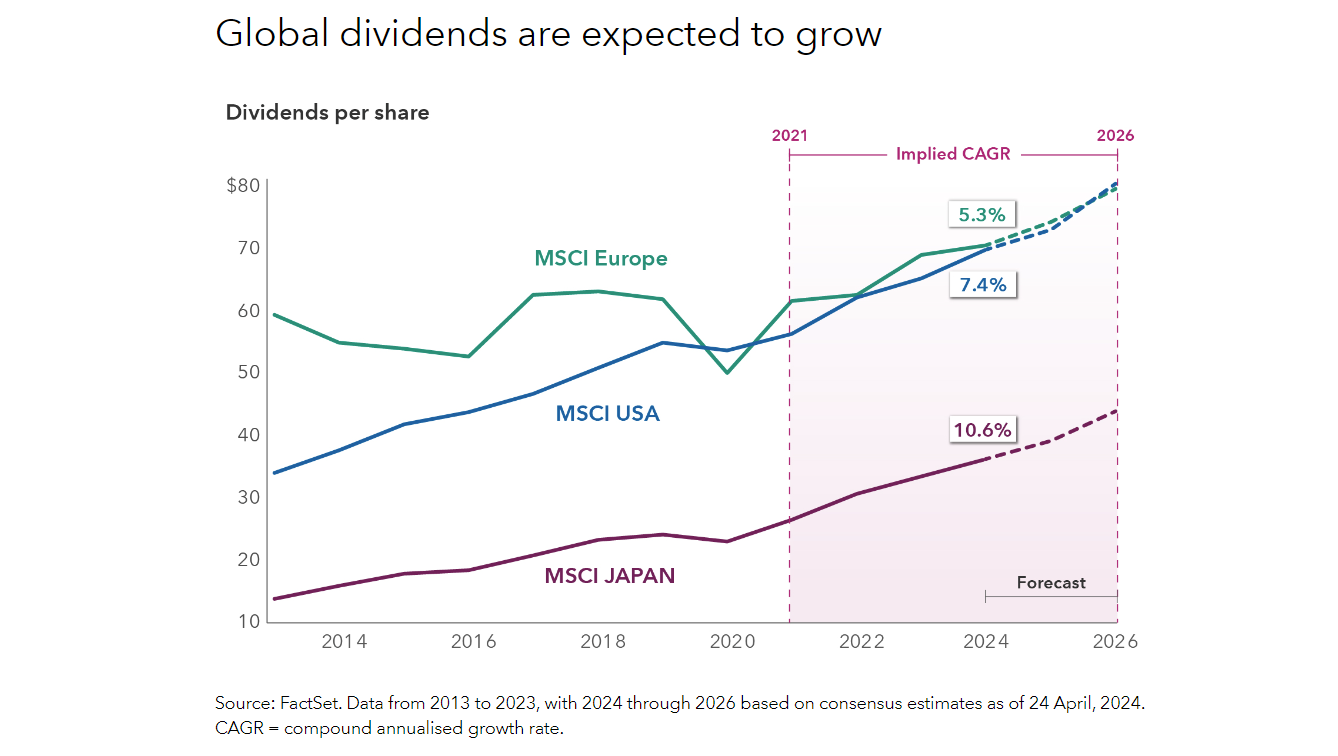 Gezien de stijgende kasstromen en de verwachte winstgroei voor Amerikaanse aandelen, worden de vooruitzichten voor dividenden rooskleuriger. Volgens de S&P Dow Jones Indices zal de S&P 500 voor 2024 naar verwachting 6 procent meer uitkeren, vergeleken met een stijging van 5 procent in 2023.