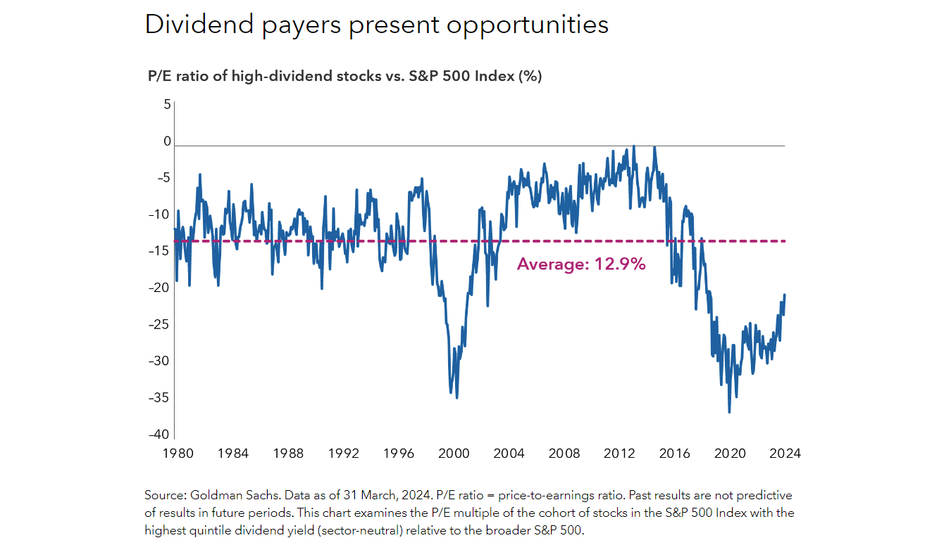 Het is dus mogelijk dat bedrijven die dividend uitkeren een herwaardering krijgen. De koers-winstverhouding van aandelen met een hoog dividend vergeleken met de S&P 500 is de laatste tijd achtergebleven, hoewel de verhouding geleidelijk aan verbetert.