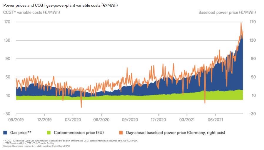 De energieprijzen in Europa gaan door het dak. In tegenstelling tot wat vaak wordt beweerd, namelijk dat dit vooral het gevolg is van de sterk gestegen emissieprijzen, heeft vooral de toegenomen vraag naar gas en de beperkte aanvoer van LNG (liquified natural gas) bijgedragen aan de explosieve prijsstijging. Europa en Azië wedijveren om aanvoer van LNG, vooral nu de gastoevoer uit Rusland lager is dan verwacht, aldus vermogensbeheerder DWS in de Chart of the Week.