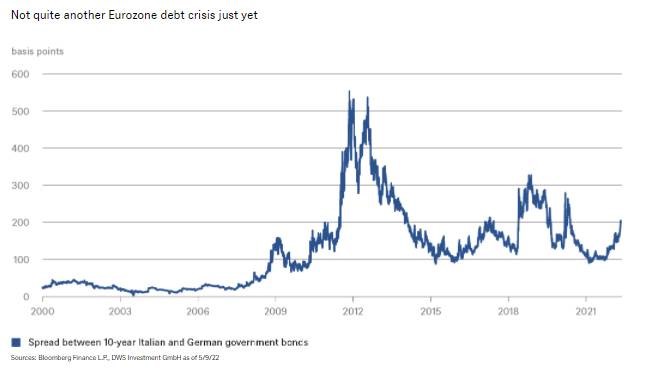 Volgens Kastens had de laars van Europa tijdens een groot deel van die periode juist overschotten, zowel op de lopende rekening als op het primaire begrotingssaldo (vóór rentebetalingen). "Door de hoge kosten van de pandemie is dit laatste omgeslagen in een tekort. Het overschot op de lopende rekening is weliswaar nog steeds positief, maar is slinkende. Bovendien blijft Italië een van Europa's productiecentra en is het land van oudsher een belangrijke importeur van Russisch olie en gas waardoor het door de oorlog in Oekraïne nu lijdt onder onderbrekingen in de bevoorrading. Om energie te besparen heeft premier Draghi terecht de thermostaten lager gezet.3)"