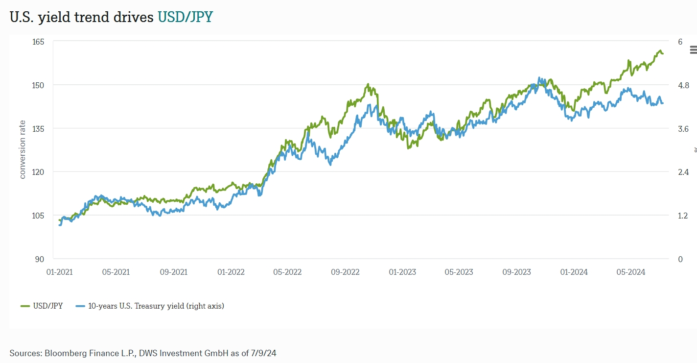 De yen staat er heel zwak voor. Dit jaar alleen al daalde de munt met 15% ten opzichte van de dollar en deze maand zakte de munt zelfs naar een peil dat we in 1986 voor het laatst zagen. Vermogensbeheerder DWS ziet voorlopig geen echte weg omhoog voor de munt, stelt valutastrateeg Xueming Song in de Chart of the Week. Het Japanse ministerie van Financiën greep volgens de markten in mei al eens in door eigen obligaties op te kopen, maar dat had geen blijvend effect op de koers, die gewoon weer inzakte. Afgelopen donderdag steeg de munt op de meevallende inflatiecijfers in de VS, maar het lijkt er eerder op dat Tokio die gebeurtenis heeft aangegrepen om de eigen munt een duwtje in te rug te geven. Maar volgens Xueming Song levert dat weinig lucht op omdat de problemen vooral te wijten zijn aan het enorme renteverschil (5%) met de VS. Japanse beleggers steken daarom liever hun geld in Amerikaanse beleggingen.