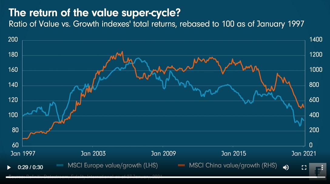 De Grafiek van de Week van Fidelity International mengt zich deze keer in het aloude debat tussen de waarde- en de groeibeleggingsstijlen, en wel met een vergelijking tussen de Europese en de Chinese invalshoek. Zo hebben in Europa veel beleggers de afgelopen weken gedacht dat de pendule terug zou zwaaien in het voordeel van waarde-aandelen. Maar volgens portefeuillebeheerder Fabio Riccelli is de recente outperformance misleidend, omdat een groot deel daarvan afkomstig is van de kleine groep cyclische aandelen die het sinds april 2020 goed hebben gedaan. In China daarentegen ziet portefeuillebeheerder Jing Ning wel een mogelijke omslag van groei- naar waarde-aandelen.