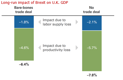 Notes: This figure shows the cumulative impact of Brexit on GDP by 2030. Productivity impact is estimated using a vector error correction model that incorporates a proxy for trade openness and foreign direct investment. Human capital growth is assumed to be unaffected by Brexit. Labor supply is assumed to grow at a similar rate to total population growth.