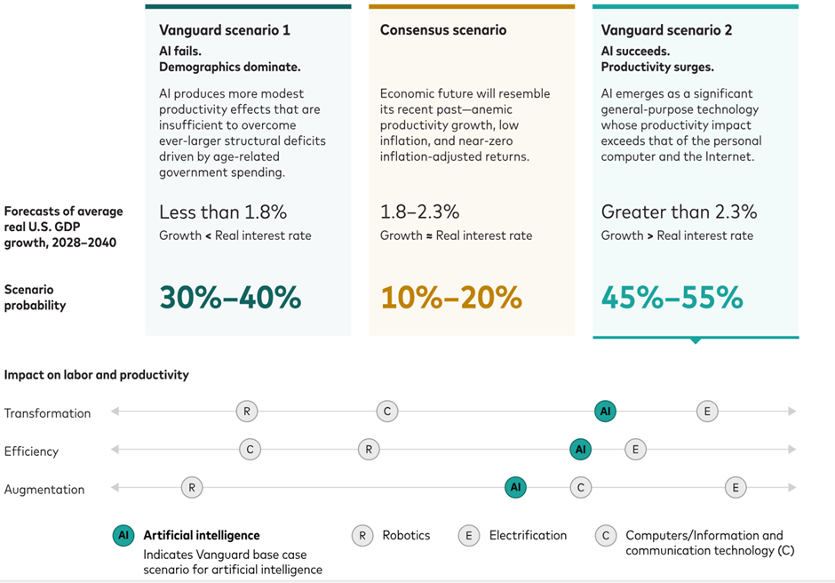 “Als AI inderdaad dezelfde impact zou hebben als elektriciteit, kan de groei van AI de demografische druk compenseren”, aldus Vanguard. Als de productiviteitswinst echter vergelijkbaar is met die van robotica, computers en internet, wegen de demografische ontwikkelingen zwaarder. De economische en financiële toekomst voldoet dan niet aan de huidige verwachtingen van de consensus.