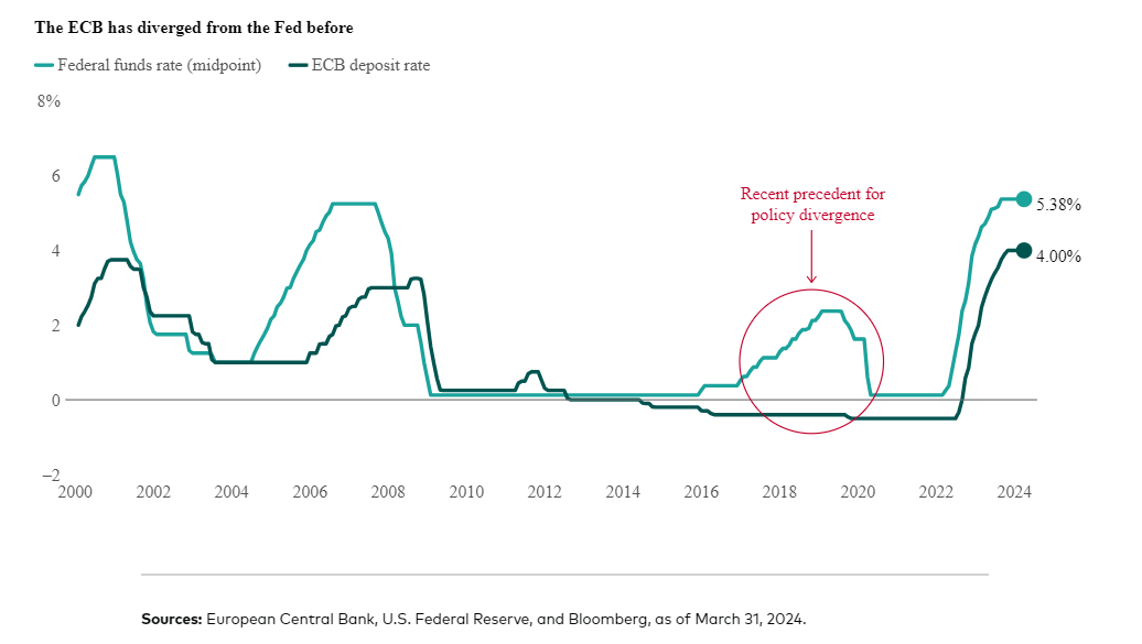 De ECB staat op het punt om in juni de eerste renteverlaging door te voeren, in tegenstelling tot de Fed. En dus vragen analisten zich af of de ECB ook in de toekomst van het beleid van de Fed zal afwijken. Jumana Salaheen, hoofdeconoom Europa van Vanguard, denkt van wel. De Fed vervult wereldwijd immers een prominentere rol en moet daarom meer dan alleen de binnenlandse omstandigheden in beschouwing nemen. Daardoor neigt de Fed ernaar minder snel actie te ondernemen, vooral wanneer de neerwaartse druk op de euro toeneemt.